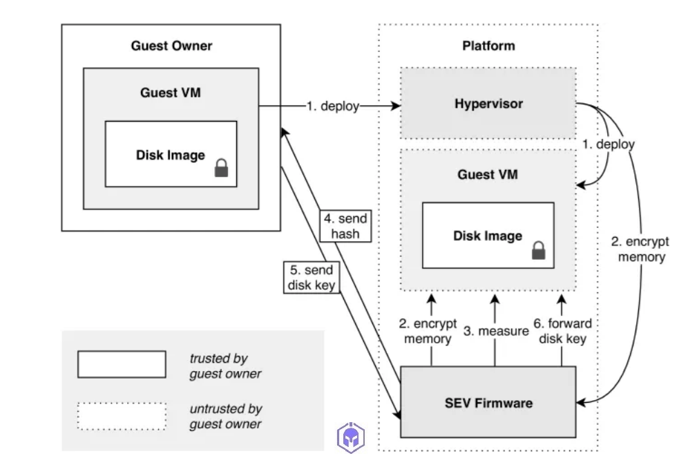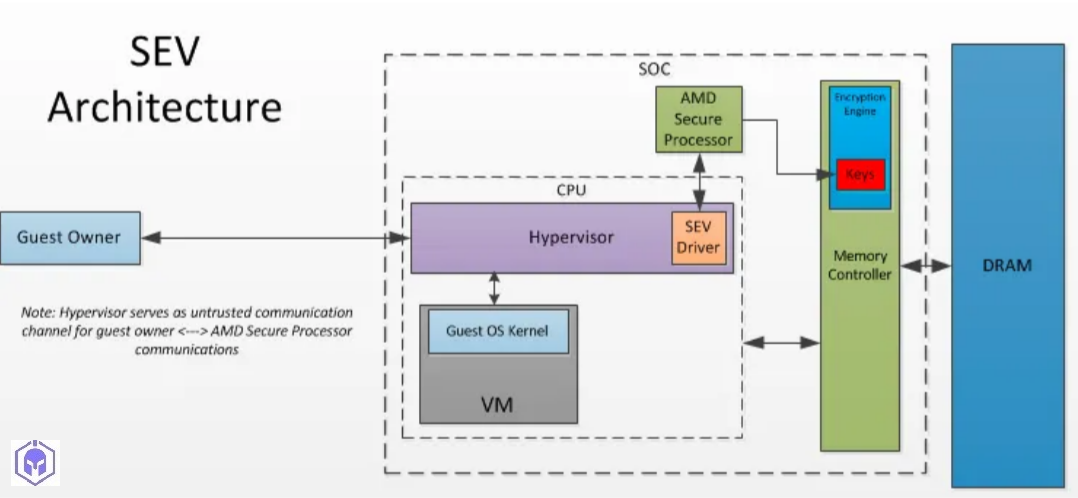 AMD introduced Secure Encrypted Virtualization (SEV) in 2016 as the first x86 technology designed to isolate Virtual Machines (VMs) from the hypervisor. SEV works by using main memory encryption, assigning a unique AES key to each VM to automatically encrypt its in-use data. When a component like the hypervisor attempts to read a guest’s memory, it only sees the encrypted bytes.