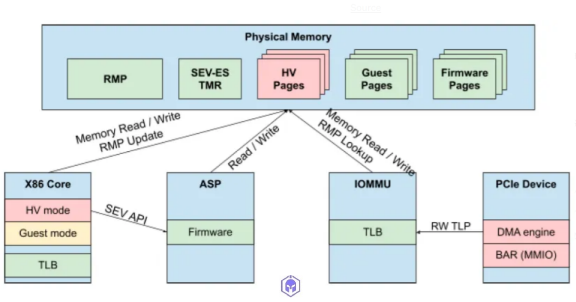 2. Reverse Map Table (RMP): The RMP is a system-wide data structure containing one entry for every 4k page of DRAM. It tracks the owner (hypervisor, specific VM, or AMD-SP) of each page, and controls access so that only the owner can write to that page. The RMP is used to protect against Replay Protection, Data Corruption, and Memory Aliasing attacks.