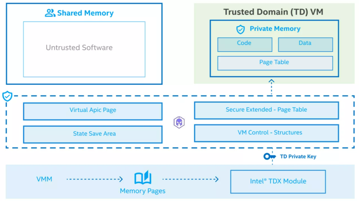 For deployments requiring an accelerator or GPU, Intel is introducing Intel® TDX Connect to provide a secure channel for communicating directly with PCIe-compliant accelerators from any vendor. Currently, Intel supports the secure use of Nvidia accelerators using bounce buffers—a software-based solution that provides core functionality ahead of the availability of the full hardware-based Intel TDX Connect.